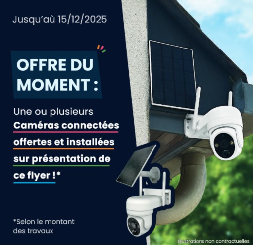 Si vous nous commandez des travaux de remplacement de fenêtres, portes, baies coulissantes, porte de garage, installation de portail, clôture, automatisme, stores, carport, pergola .... vous pourrez bénéficier de l'installation offerte d'une ou plusieurs caméras connectées solaires selon le montant de votre commande (1 caméra par tranche de 2500 € HT)